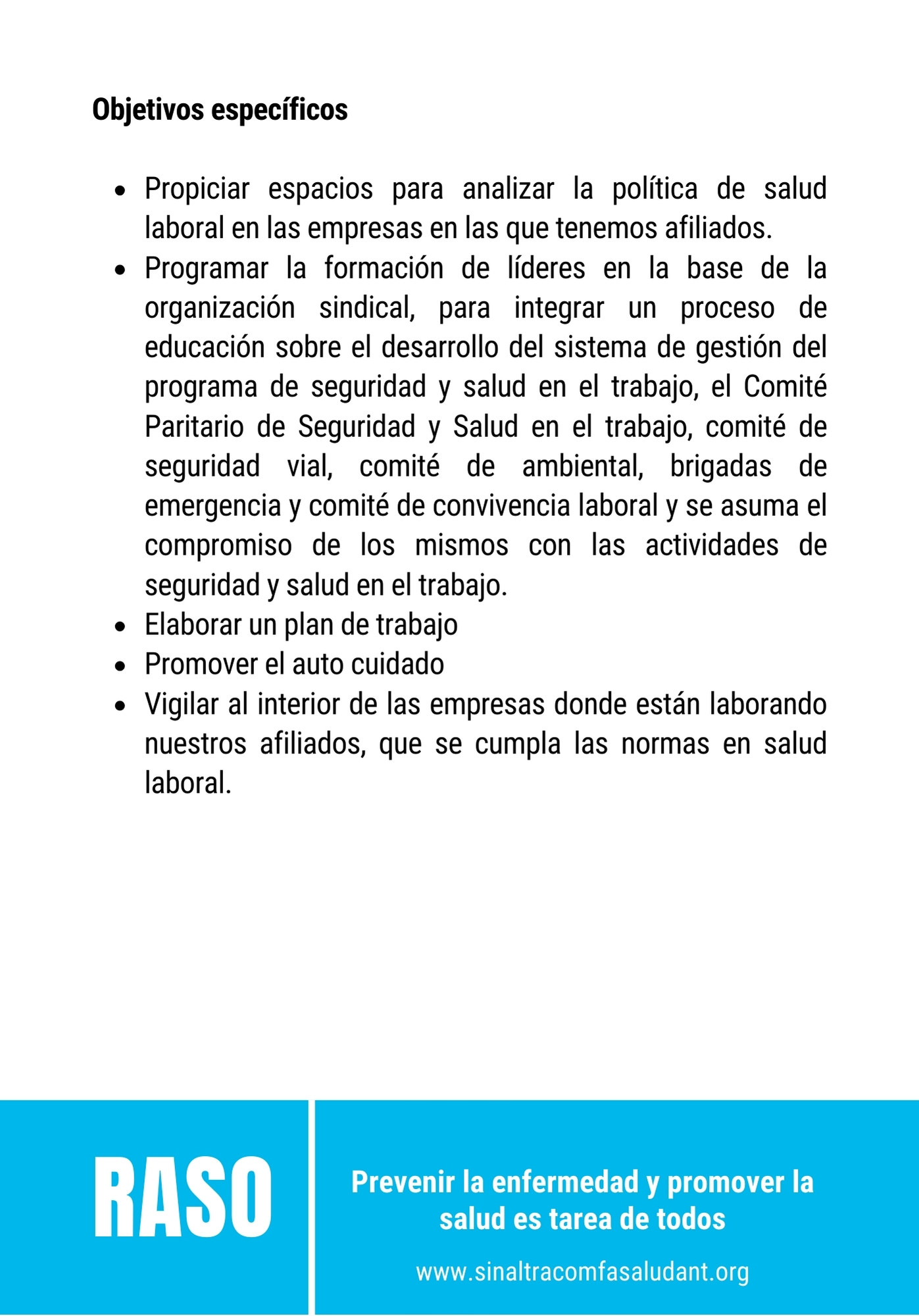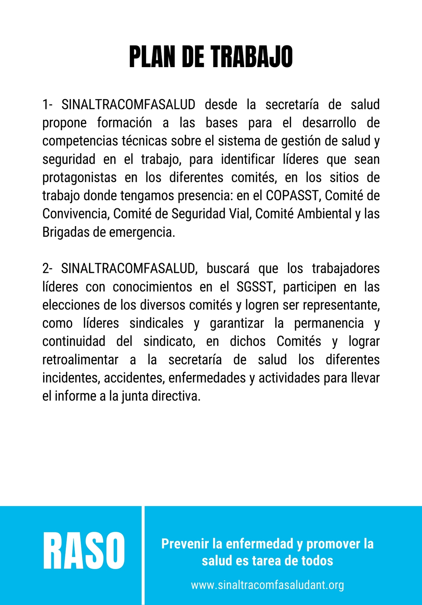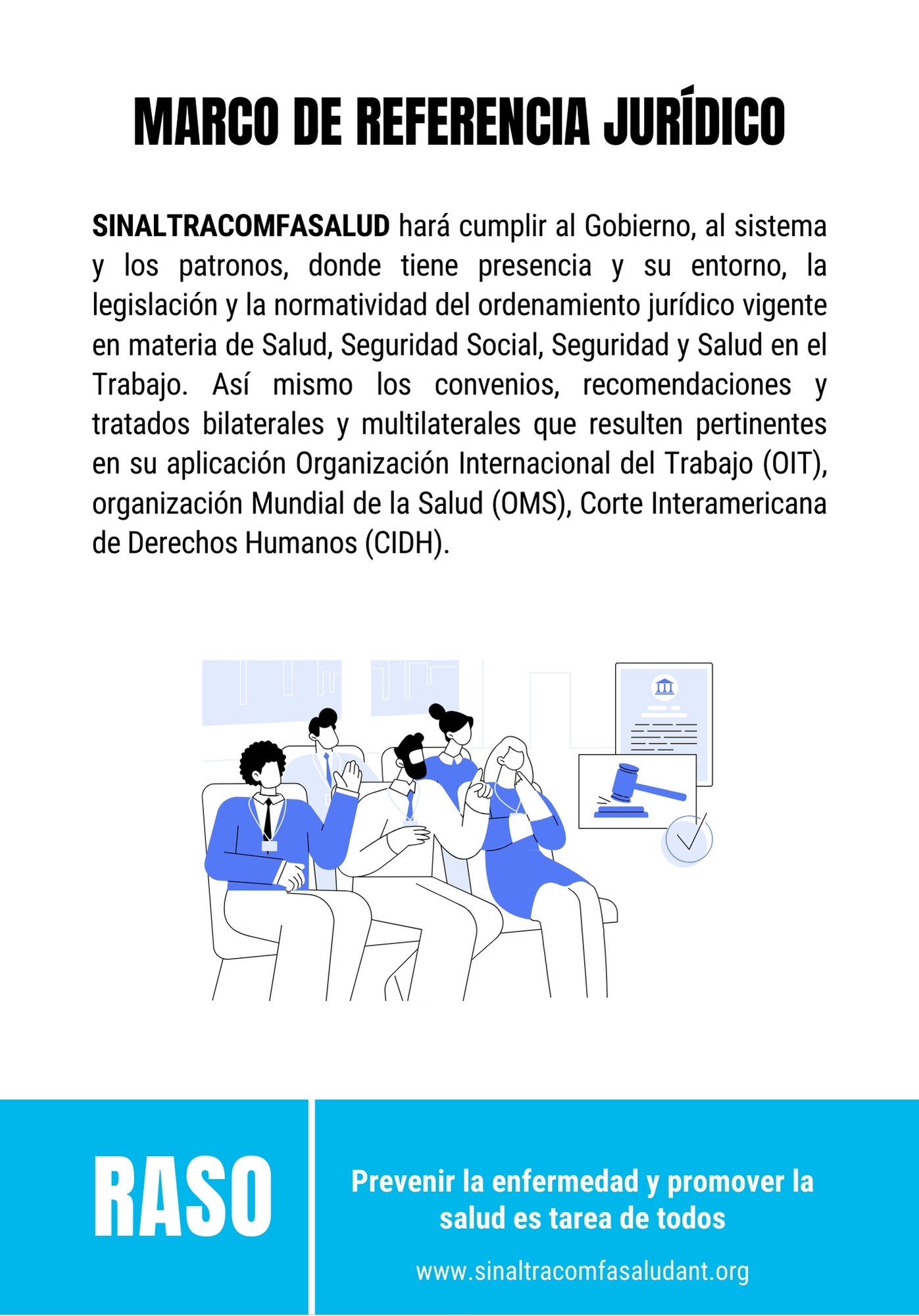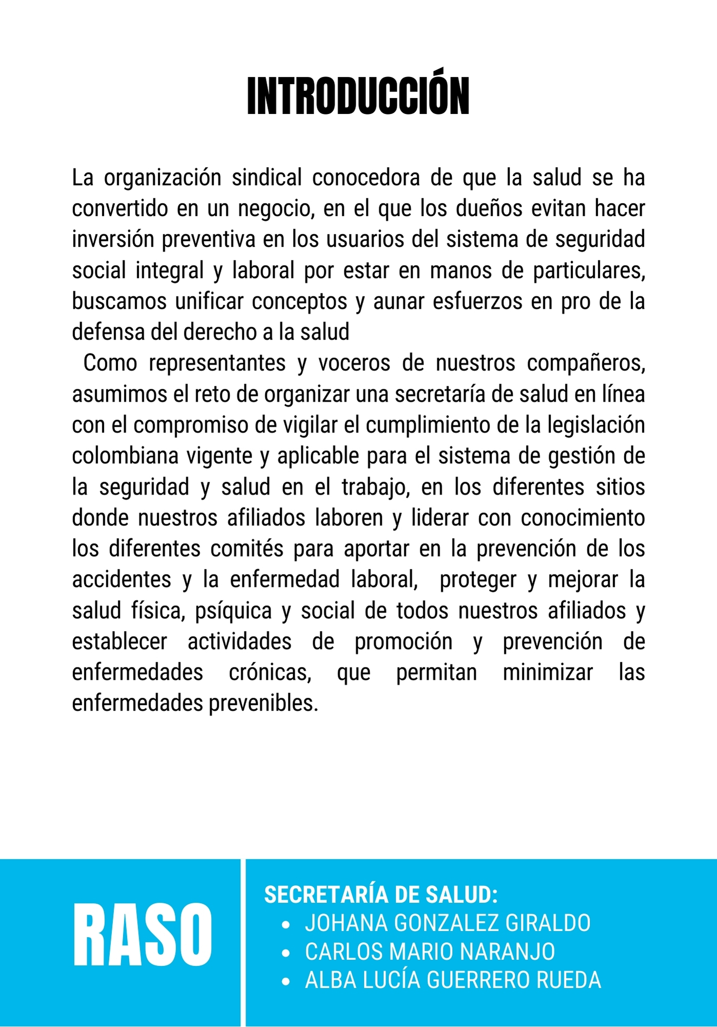Estimados afiliados de SINALTRACOMFASALUD y miembros de la comunidad obrera. Nos complace invitarlos a descargar y estudiar las memorias de la serie de eventos RASO (Reunión Académica de Salud Ocupacional), organizados con el compromiso de defender y promover el derecho a la salud en el entorno laboral. En un contexto donde la salud se ha convertido en un negocio y la inversión preventiva es frecuentemente relegada, nuestro sindicato asume el reto de unificar conceptos y aunar esfuerzos para proteger y mejorar la salud física, psíquica y social de todos nuestros afiliados.