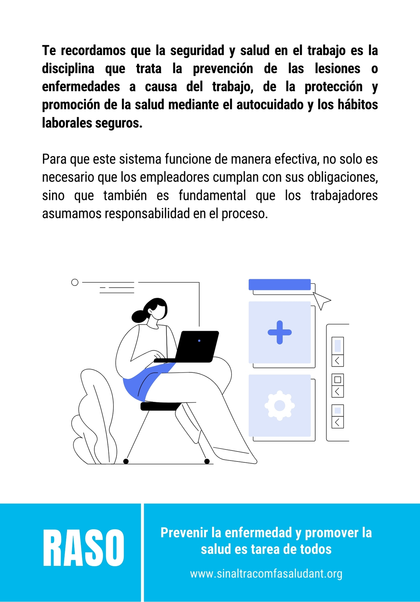 Te queremos recordar que la seguridad y salud en el trabajo es la disciplina que trata la prevención de las lesiones o enfermedades a causa del trabajo, de la protección y promoción de la salud mediante el autocuidado y los hábitos laborales seguros.